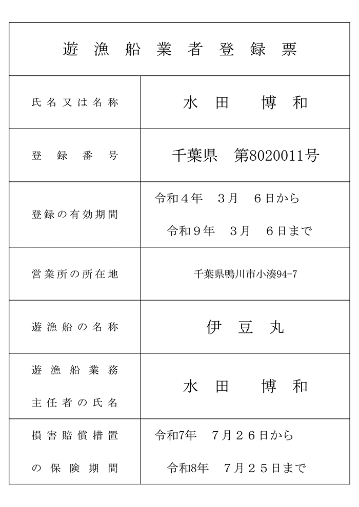 遊漁船業務規程 | 遊漁船業者登録票 《PDF(PC向け)》 《JPG(モバイル向け)》 |